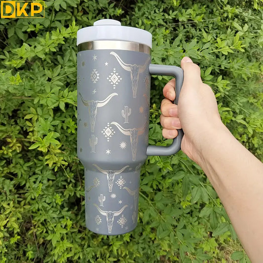 40oz Cowhead Pattern Tumbler Stainless Steel Insulated Cup With Lid and Straw